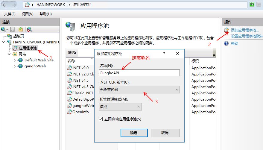 輸入應用程序池名稱,選擇“.NET CLR 版本”為“無托管代碼”。